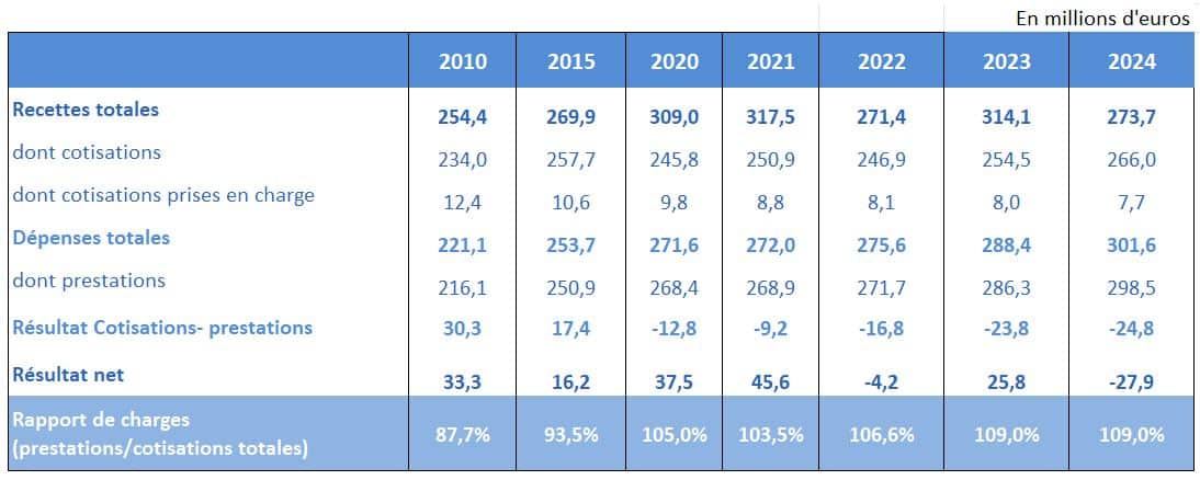 Même si les cotisations connaissent une progression sensible cette année (+ 4,5 %), cela ne suffit pas à couvrir la progression des dépenses. Rapporté aux seules cotisations, le résultat technique se dégrade de – 23,8 M€ à – 24,6 M€ entre 2023 et 2024.